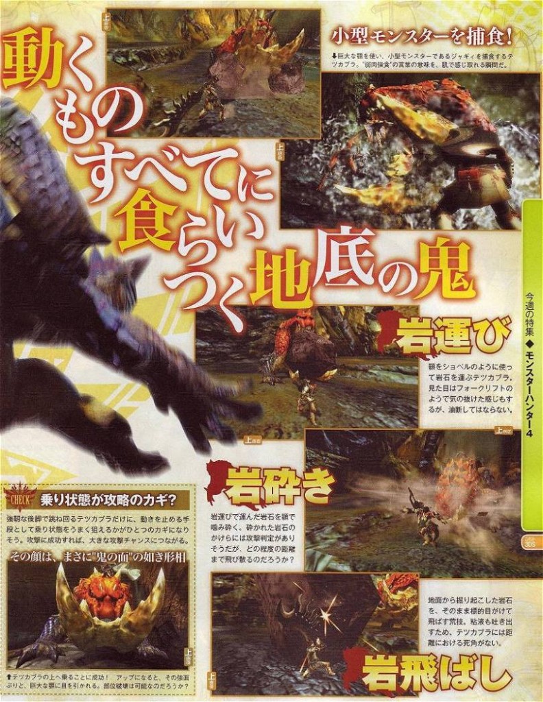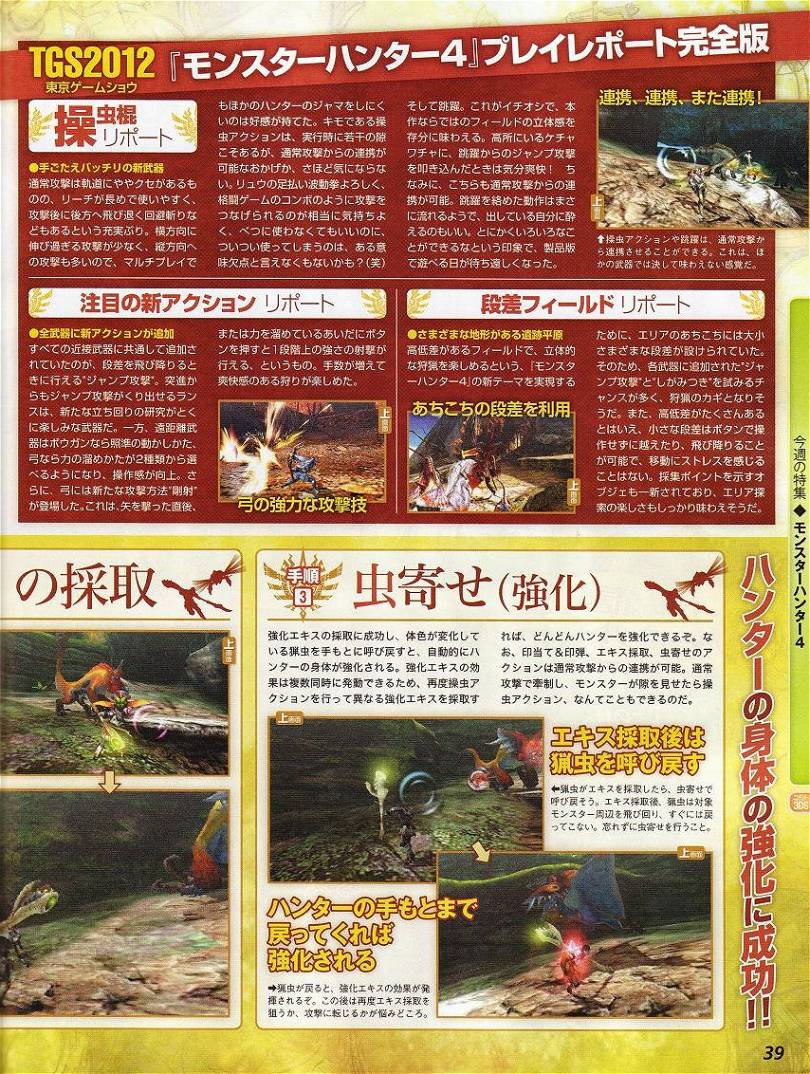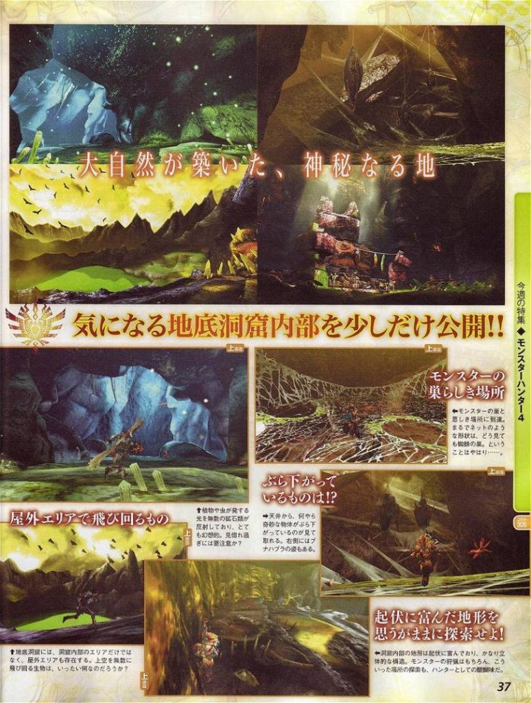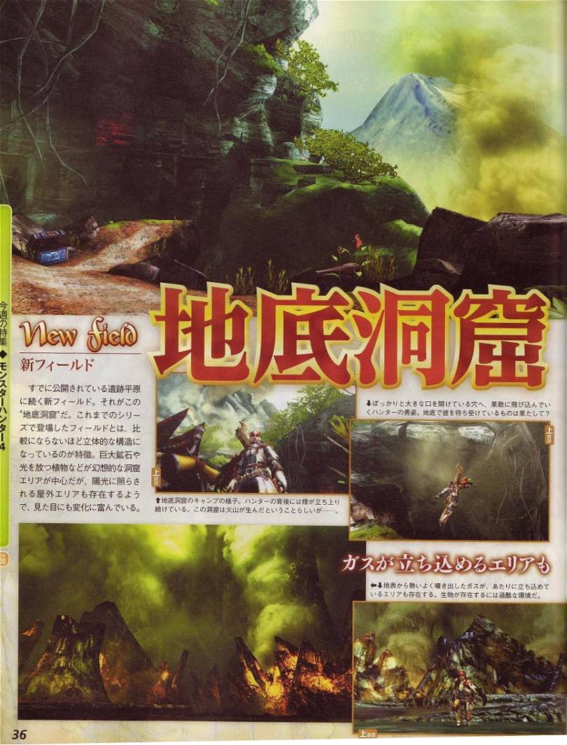 ภาพสแกนชุดล่าสุดของเกม Monster Hunter 4 จากนิตยสาร Famitsu ของญี่ปุ่น ในภาพสแกนชุดนี้จะทำให้ผู้เล่นได้เห็นรายละเอียดต่างๆในตัวเกมมากยิ่งขึ้นไม่ว่าจะเป็นบอสตัวใหม่ที่ดูคล้าย Nerusukyora กับ Tetukapura หรือพื้นที่ในการล่าใหม่ถ้ำใต้ดิน เกมล่าแย้สุดฮิตของค่าย Capcom ภาคนี้มีกำหนดวางจำหน่ายเดือนมีนาคมปี 2013 ที่ญี่ปุ่น