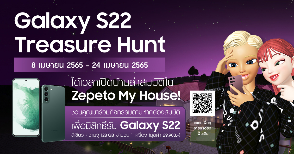 แคมเปญ Galaxy S22 Treasure Hunt จัดขึ้นระหว่างวันที่ 8 – 24 เมษายน 2565 เพื่อเปิดพื้นที่ให้ผู้เข้าร่วมได้ตามล่าหาสมบัติ พร้อมกับกิจกรรมสุดเอ็กซ์คลูซีฟสำหรับประเทศในภูมิภาคเอเชียตะวันออกเฉียงใต้ที่ให้ผู้เล่นโชว์ไอเดียสุดเจ๋ง และพิเศษสุดสำหรับแฟนๆ ประเทศไทย มีสิทธิ์รับ Galaxy S22 นอกจากนี้ยังมีไอเท็มพิเศษกับคอลเลคชัน S22 สำหรับตกแต่งตัวละครและ ZEPETO coins สำหรับช้อปปิ้งในเกมอีกด้วย โดยแคมเปญนี้จัดขึ้นบน[1]แพลตฟอร์ม My House ซึ่งเป็นความร่วมมือระหว่างซัมซุงและ ZEPETO จาก Naver Z แพลตฟอร์มเมตาเวิร์สที่ใหญ่ที่สุดในเอเชีย และมีผู้ใช้มากกว่า 300 ล้านคนทั่วโลก