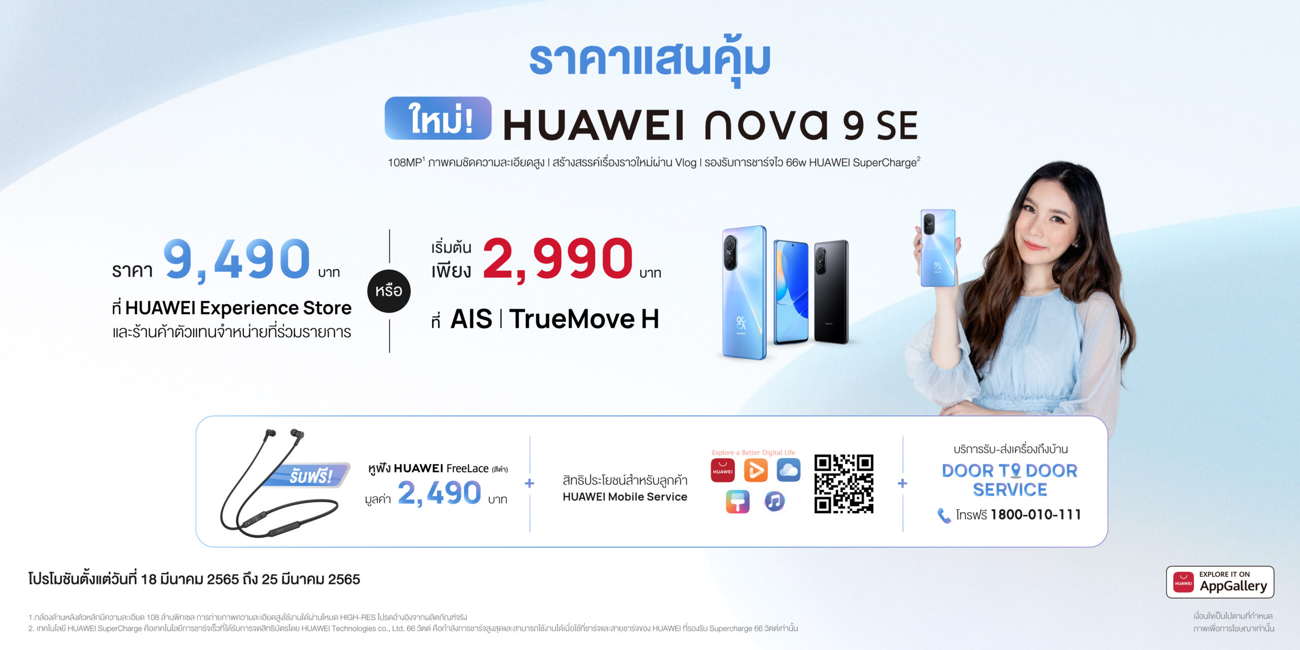 เรียกได้ว่า HUAWEI nova 9 SE เป็นสมาร์ทโฟนที่ควรค่าแก่การเป็นเจ้าของจริงๆ เพราะให้มาครบทั้งดีไซน์ที่โดดเด่น และคุณสมบัติต่าง ๆ ที่ตอบโจทย์การใช้งานในทุกรูปแบบ หากใครสนใจ HUAWEI nova 9 SE สามารถจับจองเป็นเจ้าของพร้อมดีลเด็ดช่วงพรีออเดอร์สุดคุ้ม HUAWEI nova 9 SE มีให้เลือกด้วยกัน 2 สี คือ Crystal Blue และ Midnight Black วางจำหน่ายในราคา 9,490 บาท หรือ ราคาเริ่มต้นเพียง 2,990 บาท เมื่อสั่งซื้อเป็นเจ้าของผ่าน AIS และ True โดยเมื่อสั่งซื้อตั้งแต่วันที่ 18 มีนาคม 2565 ถึง 25 มีนาคม 2565 รับฟรี! HUAWEI FreeLace สีดำ มูลค่า 2,490 บาท พร้อมด้วยสิทธิประโยชน์สุดคุ้มมากมาย HUAWEI Video Plus VIP และ HUAWEI Video Movie Pass (1 เดือน) HUAWEI Music Premium (3 เดือน) Exclusive Theme/AODs ที่ออกแบบโดย HUAWEI Theme Studio (1 ปี) HUAWEI Mobile Cloud Storage ความจุ 200GB (1 เดือน) สามารถสั่งซื้อสินค้าทางเว็บไซต์ HUAWEI Store ร้านค้าอย่างเป็นทางการของหัวเว่ยบนแพลตฟอร์มออนไลน์ต่างๆ เช่น Shopee, Lazada และ JD Central รวมถึงหน้าร้าน HUAWEI Experience Store และร้านค้าตัวแทนจำหน่ายที่ร่วมรายการ และจะยังได้รับสิทธิประโยชน์พิเศษกับ HUAWEI Mobile Services เพิ่มไปอีกขั้น (รายละเอียดเพิ่มเติมใน QR Code ในภาพ)