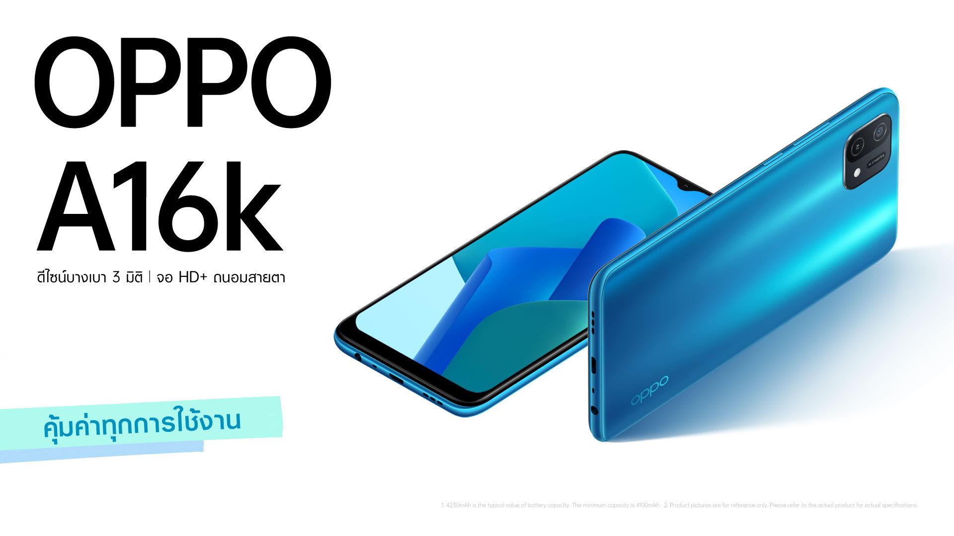 ออปโป้ ไทยแลนด์ วางจำหน่าย “OPPO A16k” อย่างเป็นทางการในประเทศไทย สมาร์ทโฟนรุ่นล่าสุดจาก OPPO A Series ที่มาในคอนเซปต์ “คุ้มค่าทุกการใช้งาน” มอบประสบการณ์การใช้งานสุดคุ้มค่าเกินราคา สวยโดดเด่นด้วยดีไซน์ฝาหลัง 3D เป็นมันวาวมาพร้อมเฟรมชิ้นกลางแบบด้านบางเพียง 7.85 มม. และมีน้ำหนักเพียง 175 กรัม ทำให้จับถือได้สบายมือ ใช้งานทั้งวันก็ยังถือได้สบาย