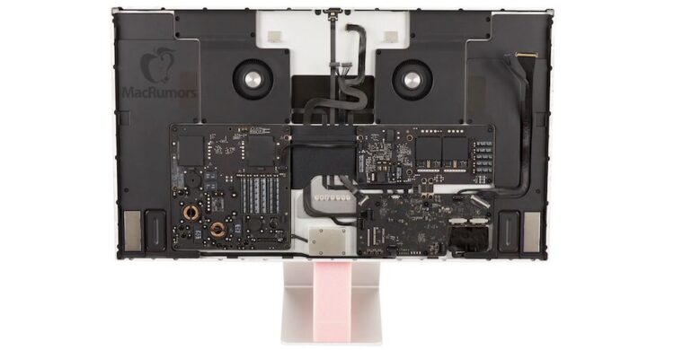 ภายใน Studio Display ยังถูกติดตั้งพัดลมไว้ 2 ตัว ที่ด้านซ้ายและด้านขวา สำหรับระบายความร้อนของจอแสดงผล มองเห็นลำโพงอย่างน้อย 4 ตัว (จาก 6 ตัว) ที่มุมด้านล่างของจอแสดงผล ดูเหมือนว่าลำโพงจะมีดีไซน์คล้ายกับใน iMac รุ่น 24 นิ้ว