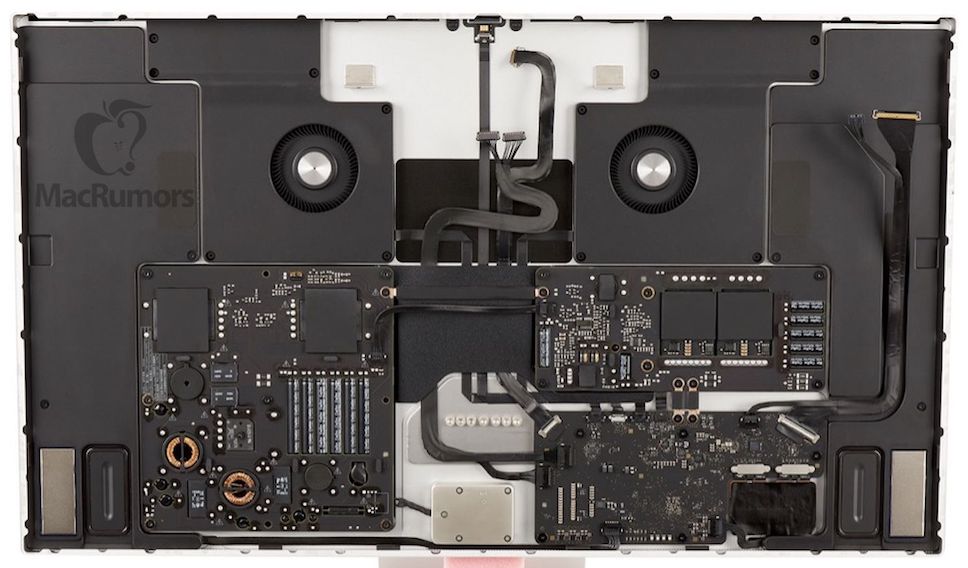รูปภาพดังกล่าวแสดงให้เห็น Studio Display ประกอบด้วยแผงวงจรขนาดใหญ่ 3 แผ่น โดยแผงด้านซ้ายและด้านขวาบนใช้สำหรับจ่ายไฟ ส่วนแผงด้านขวาล่างคือบอร์ดลอจิก ซึ่งเป็นที่อยู่ของส่วนประกอบที่สำคัญ อย่างชิป A13 Bionic และ ที่เก็บข้อมูลแฟลชขนาด 64GB