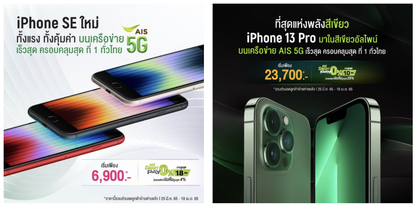 AIS 5G เตรียมวางจำหน่าย iPhone SE ที่ทรงพลัง มาพร้อมกับความสามารถและประสิทธิภาพที่โดดเด่นในราคาที่เหลือเชื่อ รวมถึง iPhone 13 Pro สีอัลไพน์กรีนที่สวยงาม และ iPhone 13 สีเขียวสะดุดตา