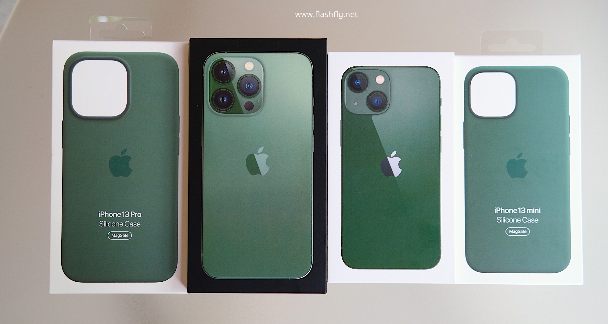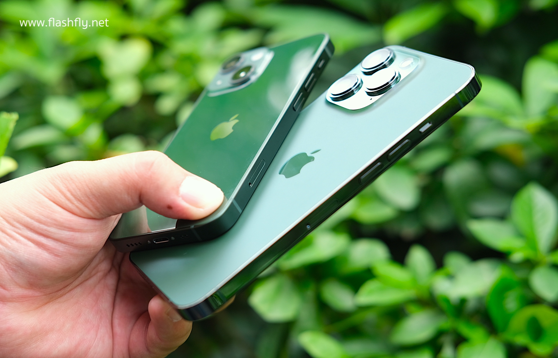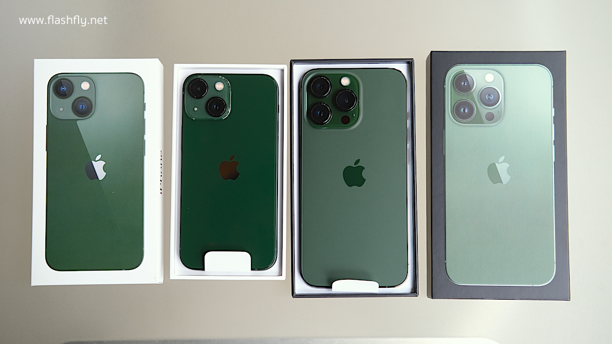 iPhone 13 Pro สีเขียวอัลไพน์ และ iPhone 13 mini สีเขียว ยังคงใช้ดีไซน์เดิมแบบเดียวกับสีสันอื่นๆ และเมื่อนำทั้งคู่มาอยู่คู่กัน ก็เห็นได้ชัดเจนว่ามีโทนสีเขียวที่แตกต่างกันไป iPhone 13 Pro สีเขียวอัลไพน์ มีพื้นผิวด้าน ซึ่งเกิดจากการนำเซรามิกโลหะหลายชั้นที่บางระดับนาโนเมตรมาเคลือบลงบนพื้นผิวกระจก ขณะที่ด้านหลังของ iPhone 13 mini สีเขียว ใช้วัสดุกระจกที่มีพื้นผิวมันเงา
