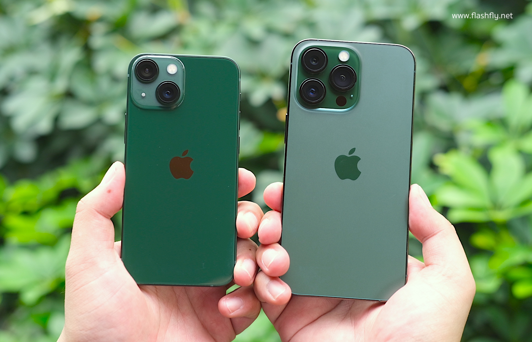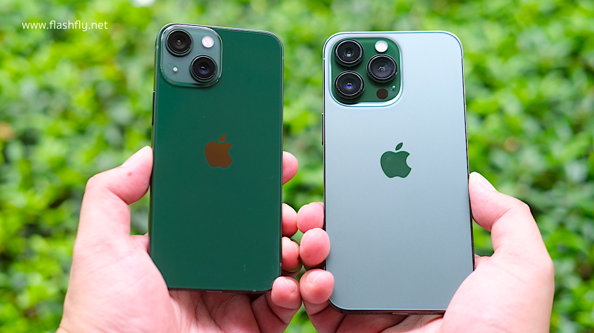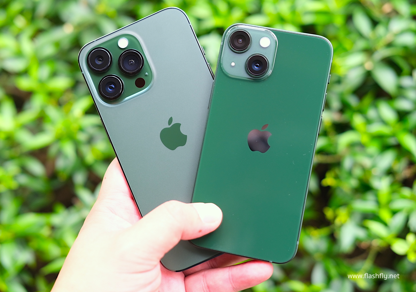 iPhone 13 Pro สีเขียวอัลไพน์ และ iPhone 13 mini สีเขียว ยังคงใช้ดีไซน์เดิมแบบเดียวกับสีสันอื่นๆ และเมื่อนำทั้งคู่มาอยู่คู่กัน ก็เห็นได้ชัดเจนว่ามีโทนสีเขียวที่แตกต่างกันไป iPhone 13 Pro สีเขียวอัลไพน์ มีพื้นผิวด้าน ซึ่งเกิดจากการนำเซรามิกโลหะหลายชั้นที่บางระดับนาโนเมตรมาเคลือบลงบนพื้นผิวกระจก ขณะที่ด้านหลังของ iPhone 13 mini สีเขียว ใช้วัสดุกระจกที่มีพื้นผิวมันเงา