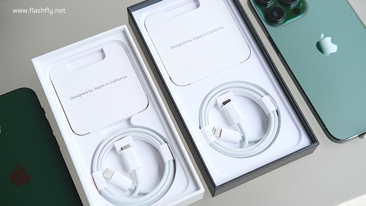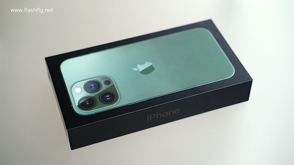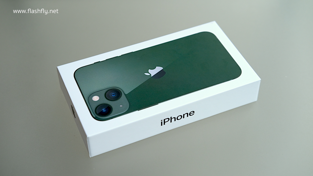 iPhone 13 Pro สีเขียวอัลไพน์ ถูกจัดส่งมาในกล่องสีดำ หน้ากล่องพิมพ์รูปภาพด้านหลังของ iPhone ขนาดใหญ่ในบอดี้สีเขียวอัลไพน์ ขณะที่ iPhone 13 mini สีเขียว ถูกบรรจุไว้ในกล่องสีขาว หน้ากล่องพิมพ์รูปภาพด้านหลังของ iPhone สีเขียว