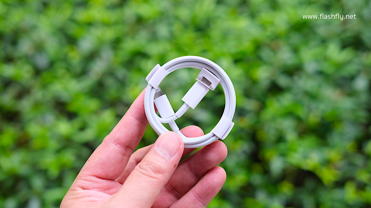 อุปกรณ์ชิ้นสุดท้ายเป็นสายเคเบิล USB‑C to Lightning ไม่ต้องตกใจที่ไม่พบอุปกรณ์ชาร์จ หรือ Power Adapter เพราะ Apple ไม่ได้แถมมาให้ตั้งแต่เปิดตัว iPhone 12 ในปี 2563 ซึ่งเป็นส่วนหนึ่งในนโยบายใส่ใจสิ่งแวดล้อมของ Apple
