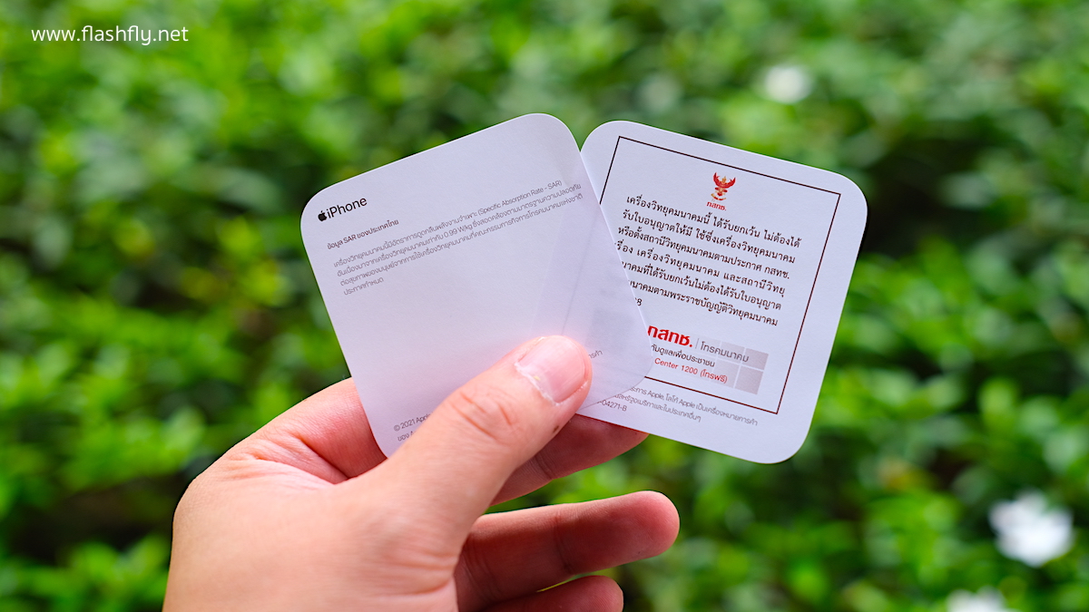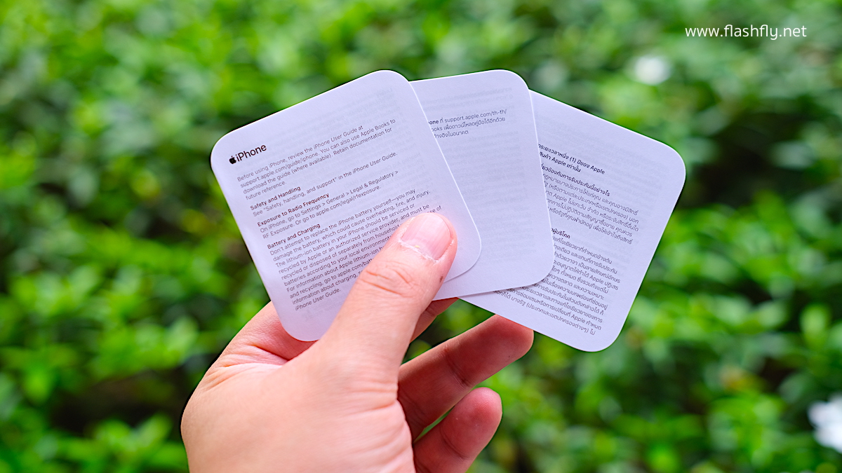 ถัดลงมาเป็นช่องเก็บซองเอกสารภายในบรรจุเอกสารต่างๆ ได้แก่ คู่มือแนะนำการใช้งานเบื้องต้น การรับประกัน และ เอกสารยืนยันว่าผ่านการรับรองจาก กสทช. อีกทั้งยังแนบเข็มช่วยถอดถาดใส่ซิมการ์ด และแถมสติกเกอร์โลโก้ Apple มาให้ 1 ชิ้น