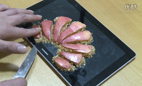 พี่จีนโชว์โหดหั่นลูก Apple บนแท็บเล็ต Huawei MediaPad 10 FHD แล้วเรียงเป็นโลโก้ (ชมคลิป)