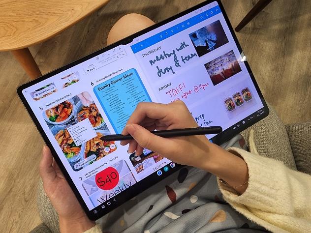 ด้วยหน้าจอ Super AMOLED ขนาดใหญ่ 14.6 นิ้วที่มาพร้อมอัตรารีเฟรช 120Hz ของ Galaxy Tab S8 Ultra ช่วยให้ผู้ใช้รับชมทุกคอนเทนต์ได้แบบเต็มตา อ่านและแก้ไขเอกสารต่างๆ ได้อย่างชัดเจนครบทุกรายละเอียด ตลอดจนใช้งานด้านความบันเทิงได้อย่างจุใจ ด้วยขอบจอที่บางกว่าทำให้เพิ่มพื้นที่การมองเห็นได้มากกว่าแท็บเล็ตทั่วไป และด้วยหน้าจอขนาดใหญ่ยังช่วยให้ใช้งานแบบมัลติทาส์กได้อย่างยอดเยี่ยมผ่านฟีเจอร์ Multi-Active Window[2] ที่สามารถเปิดใช้แอปพลิเคชันได้มากถึง 3 แอปฯ ในเวลาเดียวกัน อีกทั้งยังสามารถปรับขนาดของแต่ละหน้าต่างได้อย่างอิสระ โดยมีรูปแบบการใช้งานถึง 4 เลย์เอาท์ ไม่ว่าจะเป็นการใช้งานในแนวตั้งหรือแนวนอน แล้วแต่ความต้องการของการใช้ทำให้การจดโน้ตควบคู่ไปกับการหาข้อมูลบนอินเทอร์เน็ต พร้อมเปิดวิดีโอฟังเพลงไปด้วยระหว่างการทำงานทำได้อย่างง่ายดาย