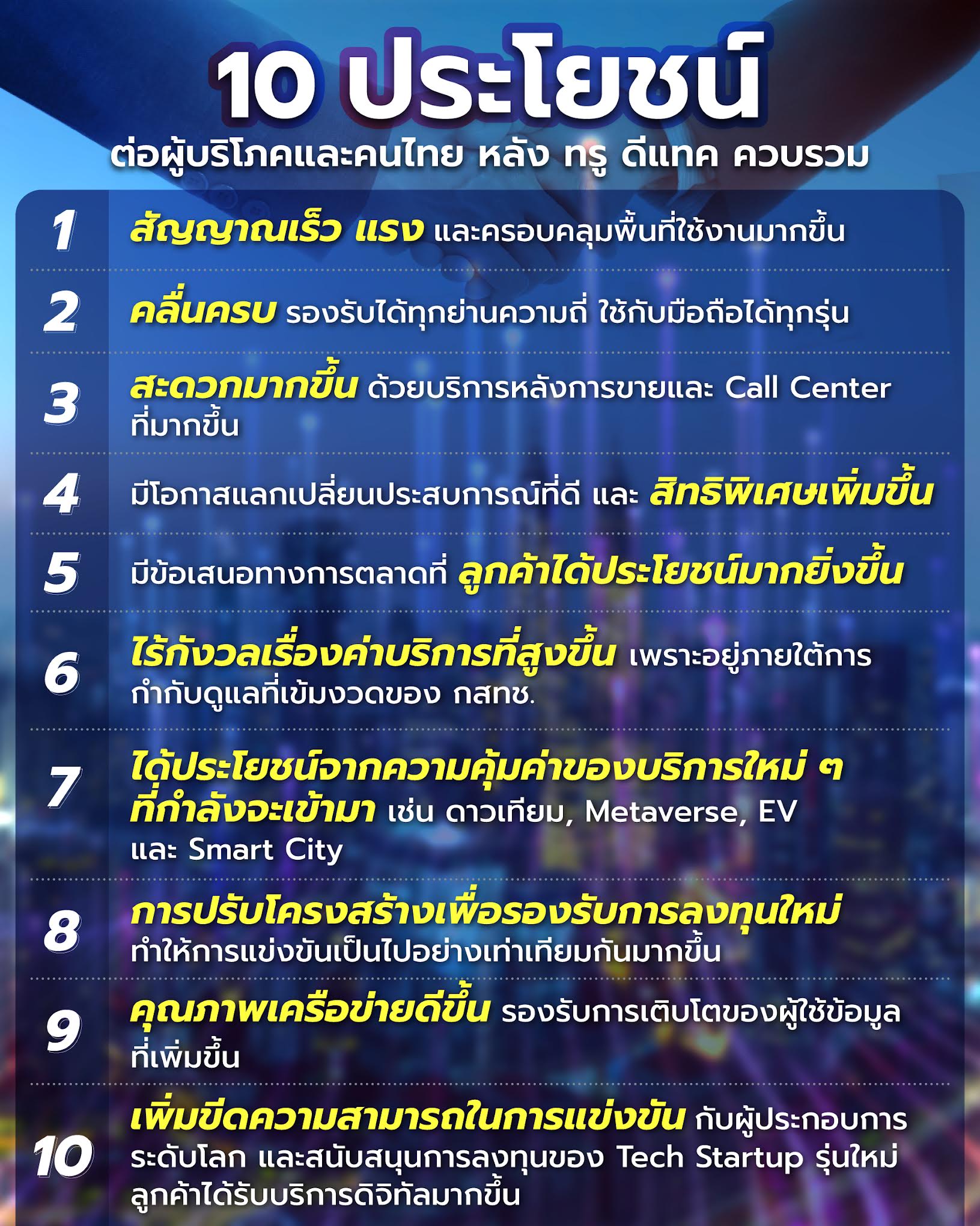 10. หลังการควบรวม ผู้เล่นทุกรายในอุตสาหกรรมโทรคมนาคมไทย พร้อมปรับตัวเข้าสู่การเป็นบริษัทเทคโนโลยี และเพิ่มขีดความสามารถที่จะแข่งกับผู้ประกอบการระดับโลก และสนับสนุนการลงทุนของ Tech Startup รุ่นใหม่ บริษัทจะมีความสามารถในการลงทุนเพิ่ม รองรับเทคโนโลยีใหม่ ทำให้ลูกค้าได้รับบริการดิจิทัลมากขึ้น เช่น บริการแพทย์ทางไกล การประชุมทางไกล การเข้าถึงคอนเทนต์ เพลง หนัง ระดับโลก ในราคาลดลง