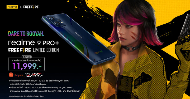 realme (เรียลมี) แบรนด์สมาร์ตโฟนเพื่อคนรุ่นใหม่ที่เติบโตเร็วที่สุดในโลก เปิดตัว “realme 9 Pro+ Free Fire Limited Edition” สมาร์ตโฟนรุ่นแรกในธีม Free Fire หนึ่งในเกมแอกชั่นสุดมันส์บนสมาร์ตโฟนที่ได้รับความนิยมทั่วโลก โดยครั้งนี้ได้เปิดตัวที่ประเทศไทยเป็นที่แรก หลังจากนั้นจะวางจำหน่ายในประเทศอื่น ๆ ทั่วโลก