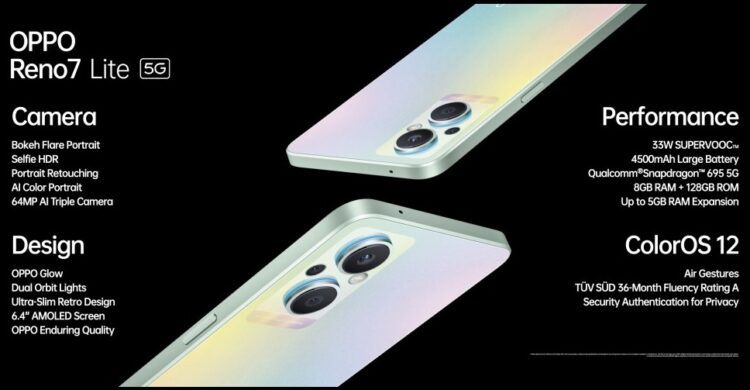 OPPO Reno7 Lite 5G ทำงานบน ColorOS 12 ใช้ชิปประมวลผล Qualcomm Snapdragon 695 ความจำ RAM 8GB จับคู่กับ ROM 128GB ความจุแบตเตอรี่ 4,500mAh รองรับชาร์จเร็ว 33W