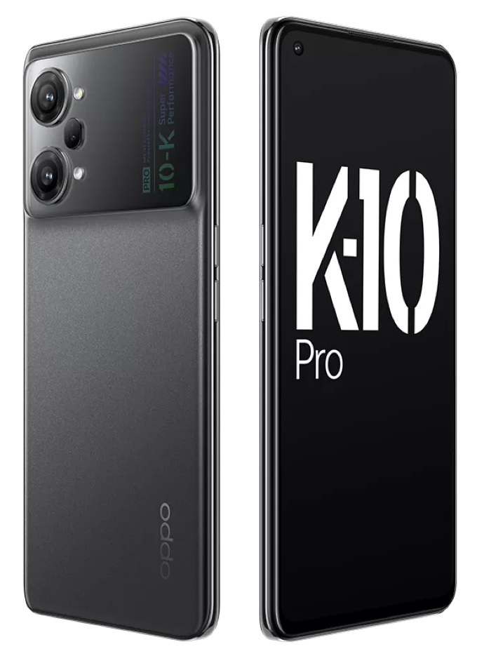 OPPO K10 Pro ใช้ชิปประมวลผล Qualcomm Snapdragon 888 ความจุแบตเตอรี่ 5000mAh รองรับชาร์จเร็ว 80W ได้รับกล้องหลัง 3 ตัว ประกอบด้วย กล้องหลัก 50 ล้านพิกเซล (Sony IMX766), กล้อง Ultra Wide 8 ล้านพิกเซล และกล้อง Macro สำหรับถ่ายภาพใกล้วัตถุในระยะ 4 เซนติเมตร ส่วนกล้องหน้า 16 ล้านพิกเซล