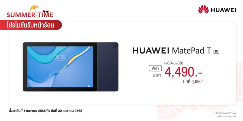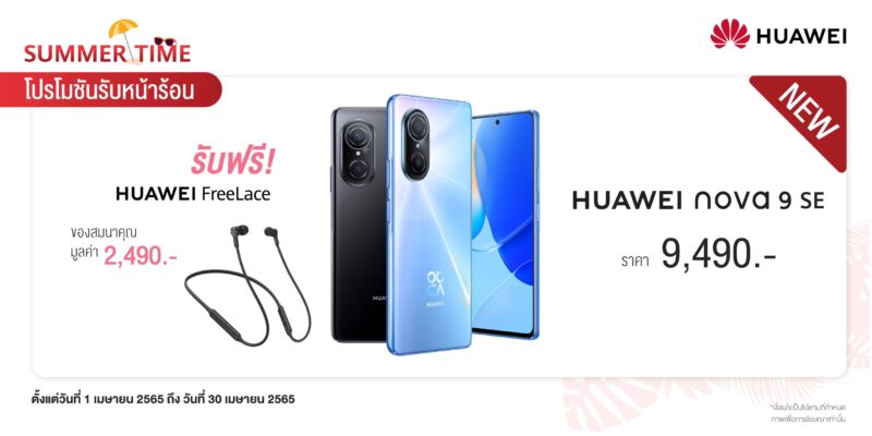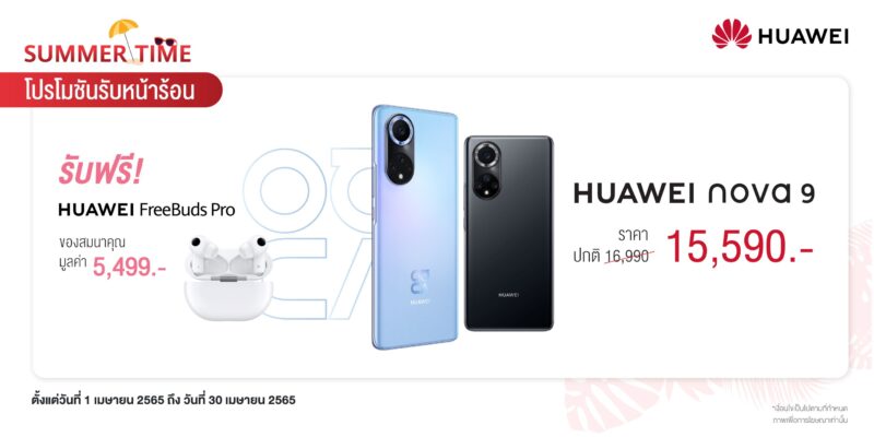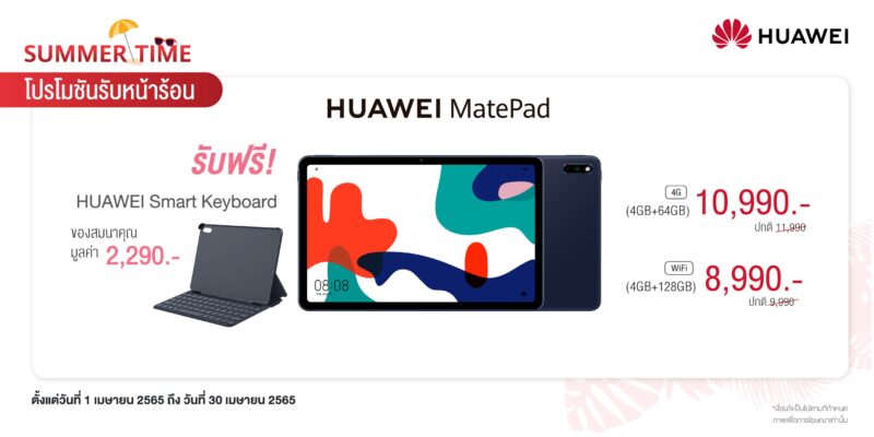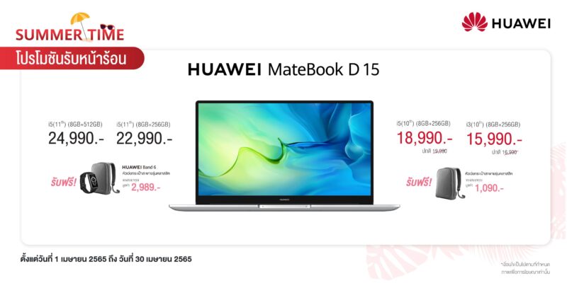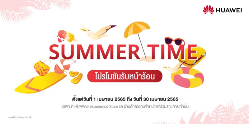 หัวเว่ย คอนซูมเมอร์ บิสสิเนส กรุ๊ป (ประเทศไทย) ยกขบวนดีไวซ์ตั้งแต่รุ่นใหม่ล่าสุดไปจนรุ่นสุดฮอต ทั้งสมาร์ทโฟน แล็ปท็อป แท็บเล็ต และ สมาร์ทวอทช์ พร้อมเสิร์ฟกับ “Summer Time” โปรโมชันรับหน้าร้อน ให้ทั้งสายเที่ยว สายเรียน สายทำงาน สายบันเทิง และสายสุขภาพให้เลือกซื้อได้อย่างจุใจ ทั้งลดราคาและของแถมสุดพิเศษให้ไปใช้เข้าชุดกันให้ครบครันเต็มประสิทธิภาพ พร้อมแล้วให้พุ่งตัวไปซื้อหาที่ HUAWEI Experience Store ทุกสาขา และ ร้านค้าตัวแทนจำหน่ายที่ร่วมรายการ ตั้งแต่วันที่ 1 เมษายน 2565 ถึง 30 เมษายน 2565