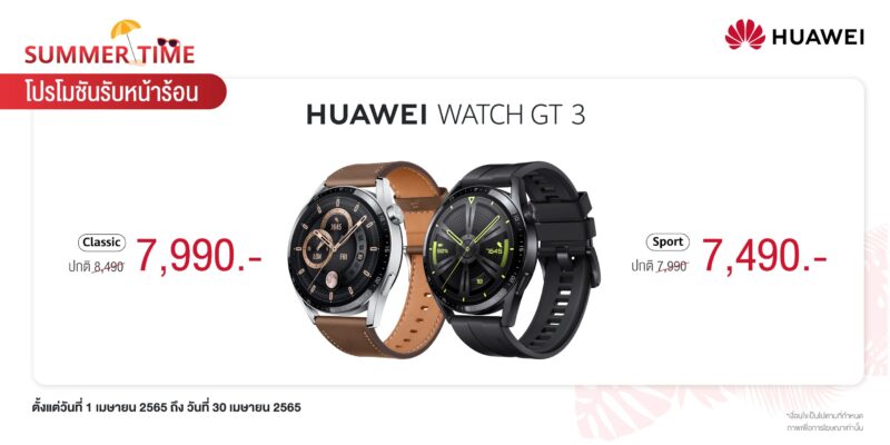 ไม่ว่าจะไปเที่ยวหรืออยู่บ้านก็รักษาสุขภาพกันได้ง่ายๆ กับ HUAWEI WATCH GT 3 Series ที่มาพร้อมความก้าวหน้าของเทคโนโลยีการตรวจวัดค่าต่างๆ ทางสุขภาพเพื่อให้ออกกำลังกายได้อย่างมีประสิทธิภาพและมุ่งสู่ระดับมืออาชีพ มีทั้งรุ่นพิเศษสำหรับสายรักการวิ่ง เน้นๆ การออกกำลังกับ HUAWEI WATCH GT Runner ลดราคาเหลือเพียง 9,490 บาท จากราคาปกติ 9,990 บาท กับ HUAWEI WATCH GT 3 รุ่น 46 มม. Classic Edition สายสีน้ำตาลเรียบหรูเหมาะกับใส่ในชีวิตประจำวัน ลดราคาเหลือเพียง 7,990 บาท จากราคาปกติ 8,490 บาท และรุ่น 46 มม. Sport Edition สำหรับสายสปอร์ตสายฟิต ลดราคาเหลือเพียง 7,490 บาท จากราคาปกติ 7,990 บาท