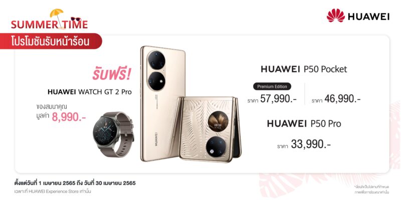 เริ่มรุ่นแรกกับสมาร์ทโฟนเรือธงสองรุ่นที่เขย่าตลาดสมาร์ทโฟนกล้องโปรตั้งแต่ต้นปี 2565 ทั้ง HUAWEI P50 Pocket และ HUAWEI P50 Pro ที่โดดเด่นด้วยดีไซน์กล้องวงแหวนคู่อันเป็นเอกลักษณ์ โดย HUAWEI P50 Pocket สมาร์ทโฟนจอพับดีไซน์ 3 มิติ ที่ผสานความงามของแฟชั่นและความอัจฉริยะของเทคโนโลยีไว้ด้วยกันอย่างลงตัว ที่สุดแห่งการพับจอแบบเรียบเนียนสนิท มาพร้อมระบบกล้องจัดเต็ม Ultra Spectrum Camera Matrix เซลฟี่คมชัดด้วยกล้องหลักความละเอียดสูงสุด 40MP พร้อมระบบความปลอดภัยแบบ Super Privacy ปิดการใช้งานกล้อง ไมโครโฟนและโลเคชันอัตโนมัติเมื่อพับเครื่อง มีให้เลือกสองสี คือ รุ่น Premium Edition สี Premium Gold ราคา 57,990 บาท และ สี White ราคา 46,990 บาท และ HUAWEI P50 Pro มาพร้อมการปฎิวัติวงการถ่ายภาพสุดล้ำกับกล้อง 4 ตัวที่พัฒนาร่วมกับ Leica กล้องหลัก 50MP True-Chroma Camera (Color) และกล้อง 40MP True-Chroma Camera (Monochrome) กล้อง 64MP Telephoto และ กล้อง 13MP Ultra-Wide Angle Camera เก็บภาพระดับโปรได้สวยทุกมิติ มาในสี Cocoa Gold และ Black ราคา 33,990 บาท เมื่อซื้อสมาร์ทโฟนเรือธงทั้งสองรุ่นนี้ที่ HUAWEI Experience Store เท่านั้น รับฟรี! HUAWEI WATCH GT 2 Pro มูลค่า 8,990 บาท