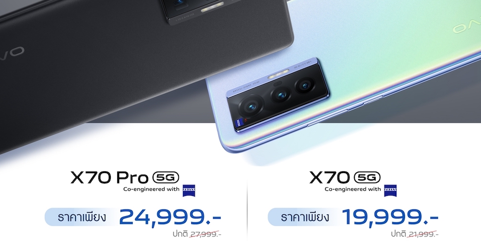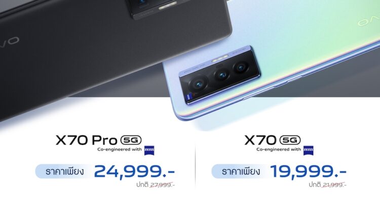 vivo ปรับราคาสมาร์ทโฟนเรือธง vivo X70 Series 5G ให้เป็นเจ้าของได้ง่ายกว่าเดิม vivo X70 Pro 5G ราคาพิเศษเพียง 24,999 บาท (จากราคาปกติ 27,999 บาท) และ vivo X70 5G ราคาเพียง 19,999 บาท (จากราคาปกติ 21,999 บาท)