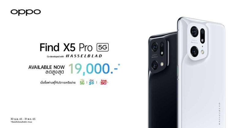 ออปโป้ส่ง OPPO Find X5 Pro 5G สมาร์ตโฟนแฟลกชิปที่ร่วมพัฒนากับ Hasselblad แบรนด์กล้องระดับโลก สานต่อประสิทธิภาพกล้องระดับตำนาน วางจำหน่ายอย่างเป็นทางการแล้ววันนี้ที่ OPPO Brand Shop ทุกสาขาและผู้จัดจำหน่ายทั่วประเทศ และพิเศษด้วยการจับมือกันระหว่างออปโป้และพันธมิตร AIS, ดีแทค และ ทรูมูฟ เอช ส่งมอบโปรโมชั่นสุดพิเศษ ลดสูงสุดถึง 19,000 บาท
