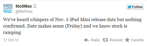 ข้อมูลดังกล่าวถูกอ้างอิงจากแหล่งข่าวที่ค่อนข้างให้ข่าวที่ถูกต้องมาก่อนหน้านี้ โดยข้อมูลข่าวลือดังกล่าวยังมีการกล่าวถึงของสื่อต่างประเทศต่างๆในทิศทางเดียวกันไม่ว่าจะเป็น TechCrunch, iMore, iFun และ Geeky Gadgets ซึ่งได้ให้ข้อมูลว่า Apple จะเริ่มวางจำหน่าย iPad mini ที่หน้าร้านค้าตัวแทนจำหน่าย รวมถึงส่งสินค้าล็อตแรกให้กับลูกค้าที่สั่งจองผ่านหน้าเว็บไซต์ในวันที่ 2 พฤศจิกายนที่จะถึงนี้  ทั้งนี้แหล่งข่าวยังระบุว่าในเบื้องต้นจะวางจำหน่าย iPad mini ในประเทศสหรัฐอเมริกาและประเทศอังกฤษก่อน ส่วนประเทศอื่นๆจะได้มีการประกาศวันวางจำหน่ายต่อไป อย่างไรก็ตามนอกจาก iPad mini แล้ว ในวันงานวันที่ 23 ตุลาคมที่จะถึงนี้ ยังคาดว่าจะมีการเปิดตัวของ MacBook Pro รุ่น 13 นิ้ว หน้าจอแบบ Retina Display ,  iMac และ Mac mini รุ่นใหม่อีกด้วย