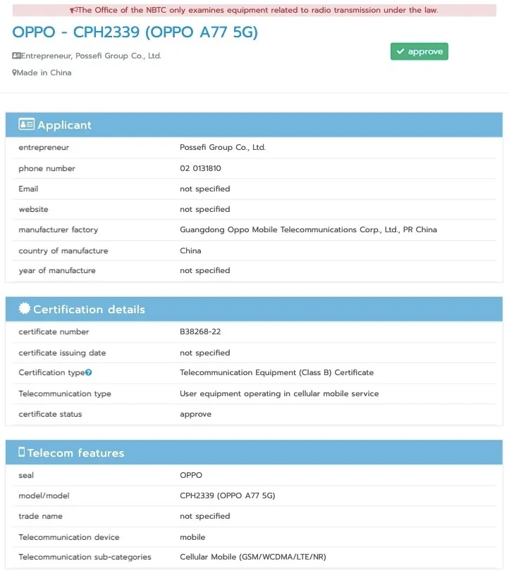 สำหรับ OPPO A77 5G มาในรหัสรุ่น CPH2339 ผ่านการรับรองจากหลายหน่วยงาน รวมถึงได้รับการทดสอบด้วย HTML5Test ซึ่งแสดงให้เห็นว่า OPPO A77 5G ทำงานบนพื้นฐาน Android 12