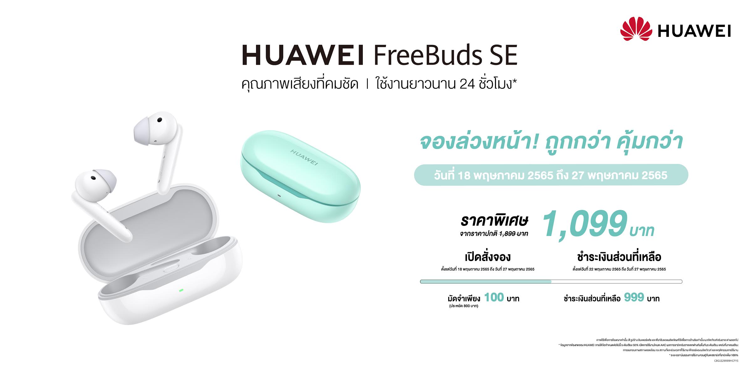 - ช่องทางออนไลน์ HUAWEI Store จ่ายเพียง 1,099 บาท จากราคาปกติ 1,899 บาท พร้อมเงื่อนไขชำระค่ามัดจำเพียง 100 บาท รับไปเลยโค้ดส่วนลดมูลค่า 800 บาท และสามารถใช้โค้ดส่วนลดได้ในระหว่างวันที่ 22 พฤษภาคม 2565 ถึง 27 พฤษภาคม 2565