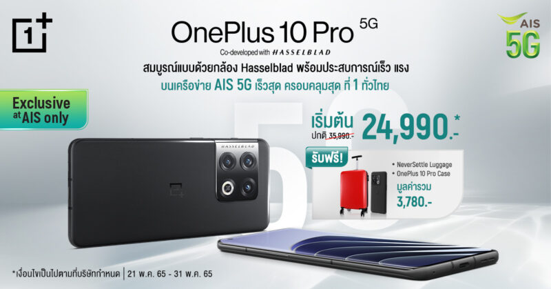เอ็กคลูซีฟที่นี่ ที่เดียว OnePlus 10 Pro 5G วางจำหน่ายแบบ Exclusive เฉพาะทาง AIS เท่านั้น โดยราคาเครื่องเปล่า 35,990 .- เมื่อซื้อเครื่องพร้อมแพ็กเกจรายเดือน Hot Deal 5G Max Speed จากเอไอเอสในราคาเริ่มต้นเพียง 24,990.- พร้อมรับสิทธิพิเศษดู YouTube Premuim นานสูงสุด 4 เดือน และ Smart Pay ผ่อน 0% สบายๆ นานสูงสุด 36 เดือน และพิเศษสุดสำหรับลูกค้าย้ายค่ายเบอร์เดิมมาเป็นครอบครัวเอไอเอสรายเดือน จะได้รับสิทธิ์ดู Disney+ Hotstar ฟรี 12 เดือน (เฉพาะที่เอไอเอสเท่านั้น) และสิทธิพิเศษอื่นๆ อีกมากมาย เท่านั้นยังไม่พอ! รับของสมาคุณจาก OnePlus ฟรี! NeverSettle Luggage และ OnePlus 10 Pro Case มูลค่า 3,780 บาท ที่ เอไอเอสช็อป, ร้านเทเลวิซทุกสาขา และช่องทางออนไลน์ของเอไอเอส คือ AIS Online Store, Line@AISShop รายละเอียดเพิ่มเติม https://www.ais.th/oneplus/oneplus-10-pro-5g