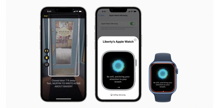 Apple Watch เข้าถึงได้ดียิ่งขึ้นกว่าที่เคยสำหรับผู้ทุพพลภาพทางร่างกายและการเคลื่อนไหวด้วยคุณสมบัติ “การสะท้อนหน้าจอ Apple Watch” ซึ่งช่วยให้ผู้ใช้ควบคุม Apple Watch ได้จากระยะไกลผ่าน iPhone ที่จับคู่ไว้ คุณสมบัติ “การสะท้อนหน้าจอ Apple Watch” ทำให้ผู้ใช้สามารถควบคุม Apple Watch โดยใช้คุณสมบัติความช่วยเหลือของ iPhone เช่น คุณสมบัติ “การสั่งการด้วยเสียง” และ “การควบคุมสวิตช์” และสามารถป้อนข้อมูลได้หลายวิธี เช่น การใช้คำสั่งเสียง การทำงานด้วยเสียง การติดตามศีรษะ หรือสวิตช์ภายนอก Made for iPhone เพื่อแทนการแตะจอภาพ Apple Watch ทั้งนี้คุณสมบัติ “การสะท้อนหน้าจอ Apple Watch” อาศัยการผสานรวมด้านฮาร์ดแวร์และซอฟต์แวร์ รวมถึงความล้ำหน้าที่ต่อยอดบน AirPlay เพื่อให้มั่นใจว่าผู้ใช้ที่ต้องพึ่งพาคุณสมบัติด้านการเคลื่อนไหวจะได้รับประโยชน์จากแอปที่มีเฉพาะบน Apple Watch เช่น แอปออกซิเจนในเลือด แอปอัตราการเต้นของหัวใจ แอปทำสมาธิ และอีกมากมาย2