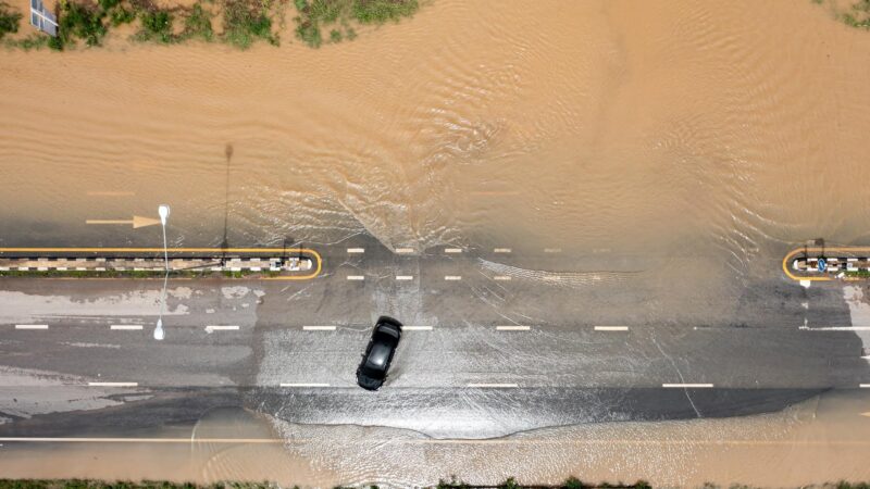 Aerial top view of Flooded the village and Country road with car, View from above shot by drone