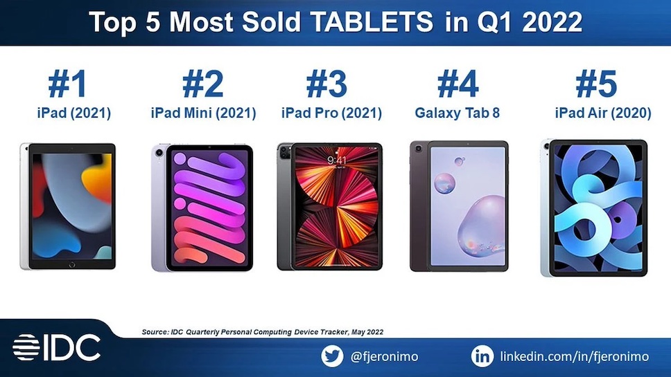 IDC (International Data Corporation) รายงานแท็บเล็ตที่ขายดีที่สุดในโลก ในช่วงไตรมาสแรกปีนี้ (มกราคม – มีนาคม 2022) โดยพบว่า 3 อันดับแรก เป็นแท็บเล็ตจาก Apple ทั้งหมด และคิดเป็น 31.8% ของการจัดส่งแท็บเล็ตทั่วโลก