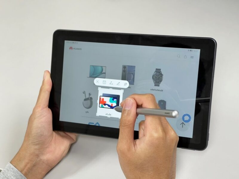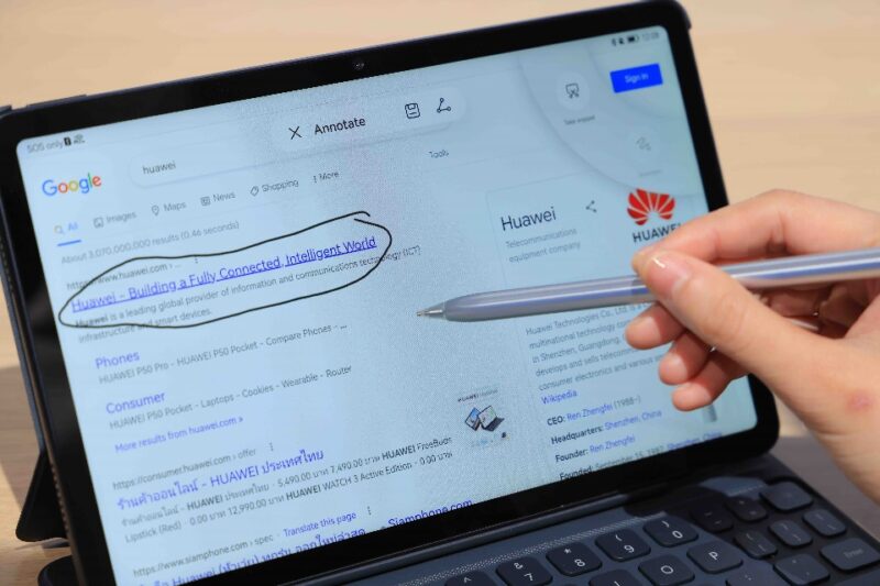 - เลือกข้อมูลสำคัญเก็บไว้: กรณีที่พบแหล่งข้อมูลออนไลน์ที่น่าสนใจมากมาย และต้องการนำไปใช้อ้างอิงในชิ้นงาน จำเป็นต้องเลือกส่วนที่สำคัญไว้ก่อนเพื่อให้เขียนข้อมูลหรือสถิติลงสไลด์ได้อย่างรวดเร็ว จะใช้วิธีแคปฯ หน้าจอแล้วเลือกไอคอนดินสอเพื่อขีดเส้นใต้ข้อความเก็บไว้อ่านก็ได้ หรือวิธีที่ง่ายขึ้นอีกบน HUAWEI MatePad 10.4-inch 2022 ก็คือ Double-tap แล้วเลือก Annotate ระบบจะจับภาพหน้าจอและให้เราขีดเขียนลงบนภาพหรือไฮไลต์ข้อความต่าง ๆ ลงไปในเอกสารที่ต้องการและสามารถบันทึกเป็นไฟล์ PNG หรือ PDF ได้อย่างง่ายดาย โดยจะเซฟเข้า Gallery ได้โดยตรง