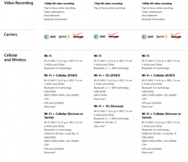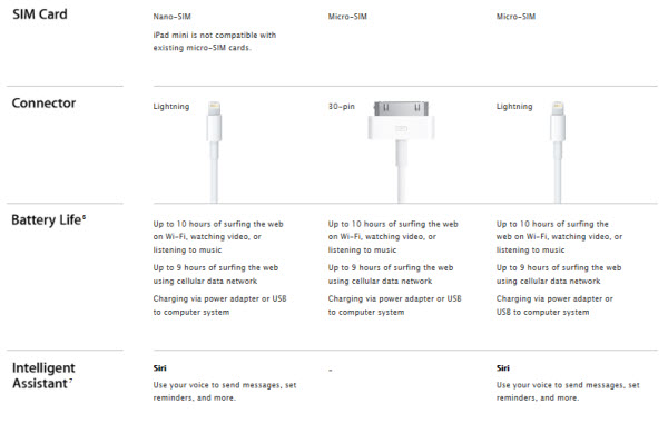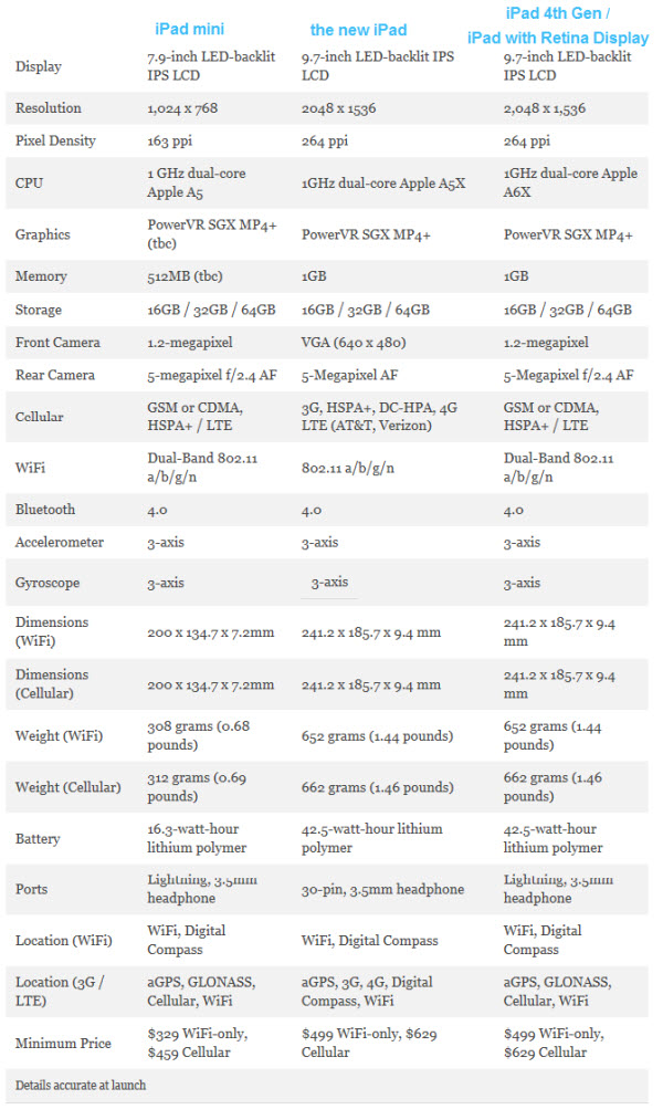 หลังจากการเปิดตัวของ iPad mini และการเปิดตัว iPad รุ่นใหม่หรือที่ถูกเรียกบนเวทีว่า iPad 4th Gen  จากงาน Apple Special Event ของ Apple ที่ผ่านมา ทำให้ Apple นั้นมีจำนวนรุ่นของแท็บเล็ตที่มากยิ่งขึ้นกว่าเดิม จนอาจทำให้มีข้อสงสัยหรือคำถามออกมาว่าแต่ละรุ่นนั้นมีสเป็คต่างกันอย่างไร และต่อข้อสงสัยดังกล่าวจึงได้มีเว็บไซต์ต่างประเทศที่ได้นำข้อมูลของสเป็คทั้ง 3 รุ่นมาเปรียบเทียบให้ดูกัน ลองมาดูตารางเปรียบเทียบกันว่า iPad mini  , the new iPad และ iPad 4th Gen นั้นมีความแตกต่างกันอย่างไรบ้าง