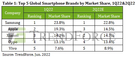 บริษัทวิจัย TrendForce ได้ออกมารายงานส่วนแบ่งการตลาดของสมาร์ทโฟนในช่วงไตรมาสที่ 1 ปี 2022 ซึ่งพบว่า Samsung ยังรักษาอันดับ 1 ไว้อย่างเหนียวแน่น ครองส่วนแบ่ง 23.8% และคาดว่าในไตรมาสที่ 2 ก็ยังคงเป็นผู้นำ ถึงแม้จะมีส่วนแบ่งลดลง ขณะที่ Apple รั้งที่ 2 ในตลาด ด้วยส่วนแบ่ง 19.3% และมีแนวโน้มที่จะถูก Xiaomi แซงหน้าในไตรมาสที่ 2 ปีนี้