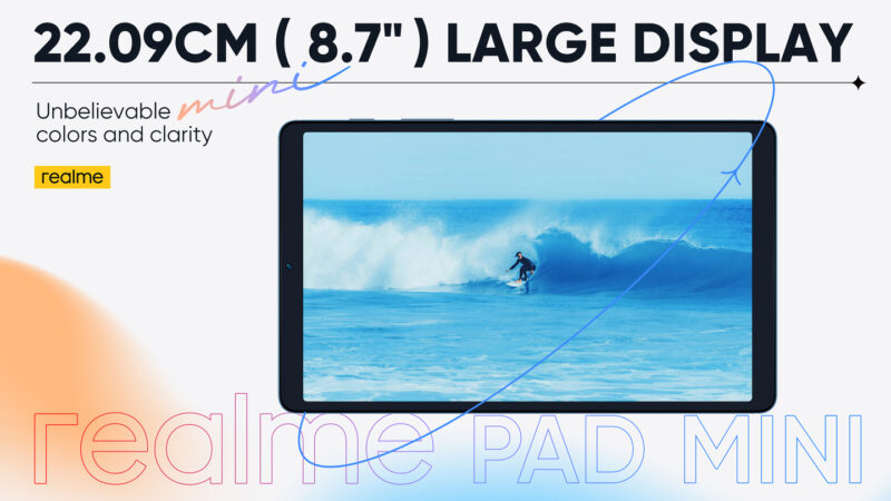 realme Pad mini ใช้จอแสดงผล 8.7 นิ้ว ความละเอียด WXGA+ (Wide Extended Graphics Array) อัตราส่วนหน้าจอต่อตัวเครื่อง 84.59% มาพร้อมลำโพงคู่สเตอริโอ คุณจึงดื่มด่ำกับคอนเทนต์ทุกรูปแบบทั้งภาพและเสียงได้อย่างเต็มอิ่ม ไม่ว่าจะเพื่อการดูหนัง ฟังเพลง เล่นเกม ก็สัมผัสได้ถึงประสบการณ์คุณภาพระดับโรงภาพยนตร์ และยังมาพร้อมความจุ 3+32GB และยังรองรับหน่วยความจำภายนอกได้สูงสุด 1TB