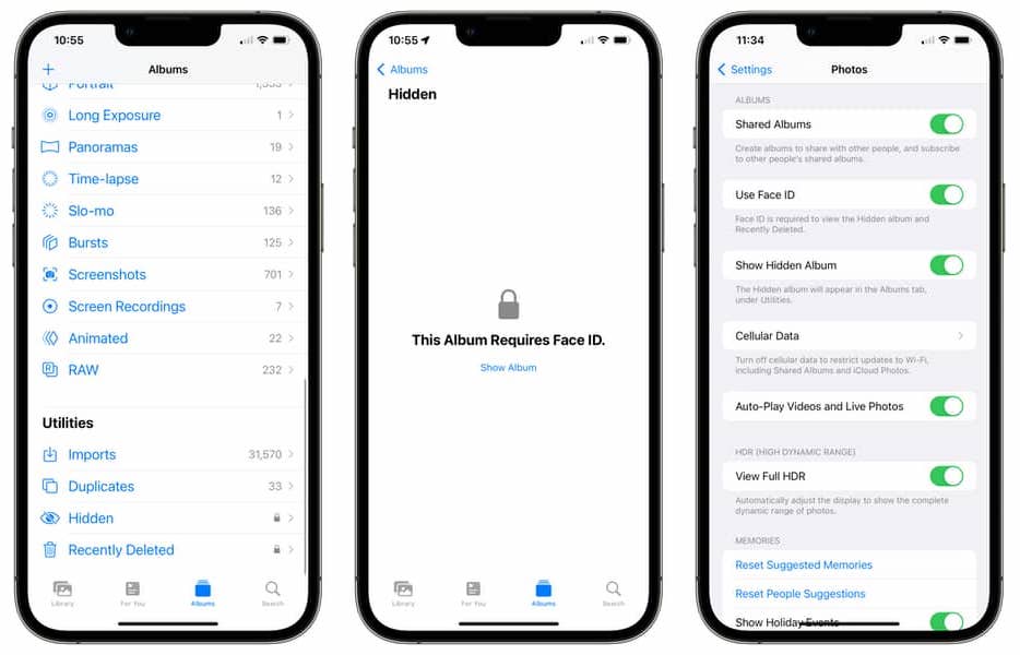 iOS 16 ได้รับการปรับปรุงความเป็นส่วนตัวในแอป Photos ด้วยระบบป้องกันการเข้าถึงรูปภาพที่ซ่อนหรือลบ จะต้องยืนยันตัวตนก่อนผ่าน Face ID หรือ Touch ID ซึ่งถูกกำหนดไว้เป็นค่าเริ่มต้น แต่สามารถปิดการใช้งานได้ในแอป Settings