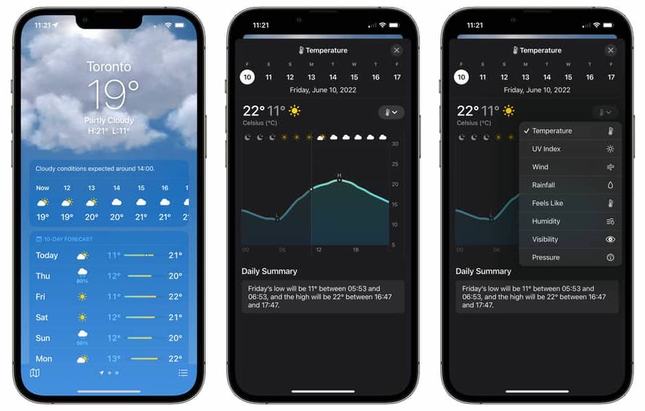 หลังจาก Apple ซื้อกิจการ Dark Sky เมื่อ 2 ปีที่แล้ว ก็มีการรวมแอปพลิเคชั่น Weather ไว้ในระบบปฏิบัติการของ iPhone และได้รับการปรับปรุงมากยิ่งขึ้นใน iOS 16 ถึงแม้หน้าตาโดยรวมยังดูคล้าย iOS 15 แต่มีการให้รายละเอียดมากขึ้นเกี่ยวกับการพยากรณ์สภาพอากาศล่วงหน้า ซึ่งครอบคลุมข้อมูลทุกอย่างตั้งแต่อุณหภูมิ ปริมาณน้ำฝน ไปจนถึงความชื้น ลม และ ดัชนี UV อีกทั้งยังสามารถตรวจสอบสภาพอากาศล่วงหน้าแบบรายชั่วโมงใน 10 วันข้างหน้า