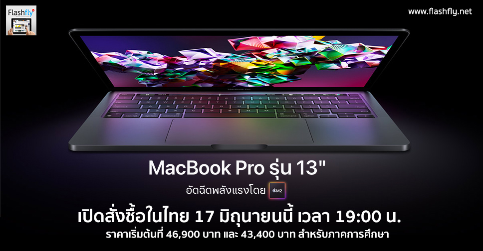 - MacBook Pro รุ่น 13 นิ้ว พร้อมชิป M2 มีให้เลือกทั้งสีเงินและสีเทาสเปซเกรย์ ในราคาเริ่มต้นที่ 46,900 บาท และ 43,400 บาท สำหรับภาคการศึกษา โดยสามารถดูข้อมูลทางเทคนิคเพิ่มเติมได้ที่ apple.com/th/macbook-pro-13