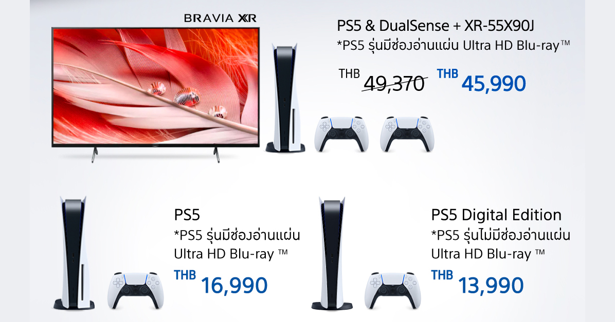 1. PlayStation5 รุ่นมีช่องอ่านแผ่น Ultra HD Blu-ray™ คู่กับคอนโทรลเลอร์ไร้สาย DualSense และ TV XR-55X90J ในราคา 45,990 บาท (ปกติ 49,370 บาท)