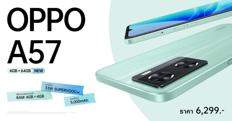 ออปโป้ ไทยแลนด์ วางจำหน่าย “OPPO A57 รุ่น RAM 4GB + ROM 64GB ” อย่างเป็นทางการในประเทศไทย สมาร์ตโฟนรุ่นล่าสุดจาก OPPO A Series ที่ตอบโจทย์ประสิทธิภาพการใช้งานได้ไหลลื่นไม่มีสะดุด ที่มาพร้อมด้วยหน่วยความจำ RAM 4GB และ ROM 64GB พร้อม RAM Expansion ที่เพิ่มหน่วยความจำได้อีก 4GB และพื้นที่จัดเก็บเพิ่มเติมถึง 1TB เสริมด้วยแบตเตอรี่ขนาดใหญ่ใช้งานยาวนาน 5,000mAh และชาร์จไว 33W SUPERVOOC ใช้งานได้ไม่มีขาดตอน เต็มอิ่มทุกความบันเทิง มอบเสียงที่สมจริงด้วยลำโพงสเตอริโอรอบทิศทาง และถ่ายรูปสวยเป็นธรรมชาติได้ง่ายๆ ด้วยกล้องหลังความละเอียด 13MP และกล้อง Depth 2MP มาพร้อมโหมด Portrait พร้อมฉากหลังเบลอ โหมด Nightscape ถ่ายภาพกลางคืนได้งดงามแม้อยู่ในสภาวะแสงน้อย และ AI Portrait Retouching ให้คุณปรับแต่งภาพได้สวยงามเป็นธรรมชาติได้ง่ายดาย โดดเด่นด้วยตัวเครื่องดีไซน์ขอบเหลี่ยมสุดคลาสสิก มาพร้อมฝาหลังแบบ OPPO Glow Design ให้ความเปล่งประกาย โดดเด่นสะดุดตา และลดรอยนิ้วมือ ทั้งยังทนต่อรอยนิ้วมือ รอยขีดข่วน มอบความสวยสะดุดตา น่าสัมผัส