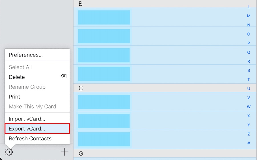 - คลิกไอคอนรูปเฟืองจากด้านล่างซ้าย และเลือก Export vCard