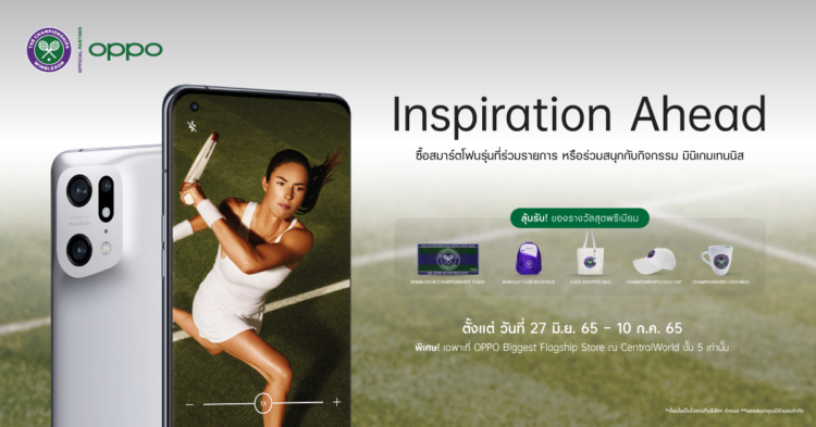 กิจกรรมพิเศษนี้ มีที่มาจาก Brand Proposition ของ OPPO อย่าง ‘Inspiration Ahead’ ที่มุ่งเน้นความสำคัญไปที่การสร้างสรรค์สิ่งใหม่ๆ ถ่ายทอดจิตวิญญาณที่สร้างแรงบันดาลใจและสื่อสารประสบการณ์ด้านนวัตกรรมเทคโนโลยีของ OPPO ให้แก่ผู้ใช้ทั่วโลก โดยในปีนี้ OPPO ได้ร่วมมือกับการแข่งขันเทนนิสระดับโลก Wimbledon นำแรงบันดาลใจจากการเล่นเทนนิสมาสู่ผู้คนที่ชื่นชอบในการแข่งขันกีฬาชนิดนี้ ให้แฟนเทนนิสได้มีส่วนร่วมในการแข่งขันอันน่าภาคภูมิใจ ด้วยเทคโนโลยีระดับแนวหน้าอย่างสมาร์ตโฟนแฟลกชิป OPPO Find X5 Pro 5G ที่พร้อมผลักดันขีดจำกัดต่างๆ เพื่อสร้างแรงบันดาลใจผ่านประสบการณ์น่าตื่นตาตื่นใจในกิจกรรมนี้