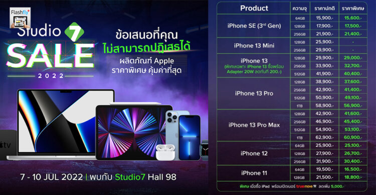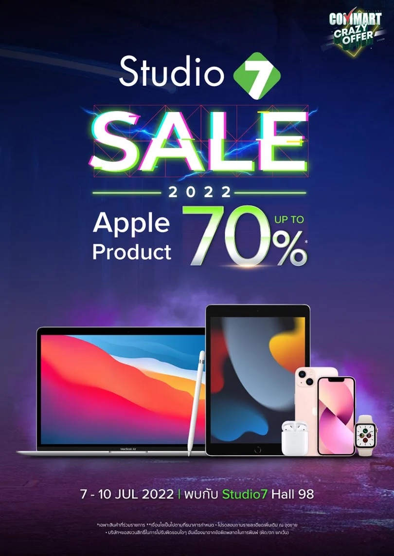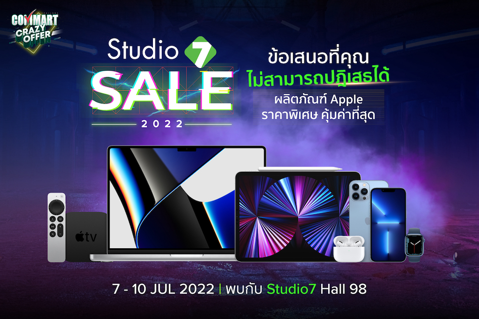 Studio 7 จัดโปรโมชั่นพิเศษ Studio 7 Sale 2022 ที่งาน COMMART Crazy Offer ด้วยกองทัพสินค้า Apple ราคาพิเศษ รวมถึงสินค้า Clearance Sale ราคาสุดพิเศษ และส่วนลดอุปกรณ์เสริมสูงสุด 70% หรือมีอุปกรณ์เครื่องเก่าก็สามารถนำมาแลกเป็นส่วนลดสำหรับซื้อเครื่องใหม่ได้