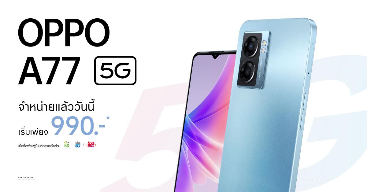 OPPO A77 5G สมาร์ตโฟน 5G สเปกครบ มาพร้อมประสิทธิภาพไหลลื่น ไม่มีสะดุด ใช้งานได้เร็วแรงตลอดวัน ตอบโจทย์การใช้งานในชีวิตประจำวันอันเร่งรีบ มาพร้อมกับโปรโมชั่นสุดพิเศษด้วยราคาเริ่มต้นเพียง 990 บาท เมื่อสั่งซื้อผ่านทางผู้ให้บริการเครือข่าย AIS, dtac และ True Store จากราคาปกติ 9,999 บาท ตั้งแต่วันนี้ถึง 31 กรกฎาคมนี้