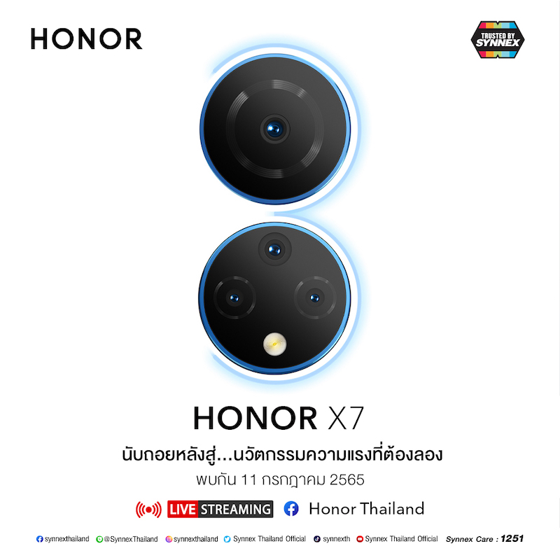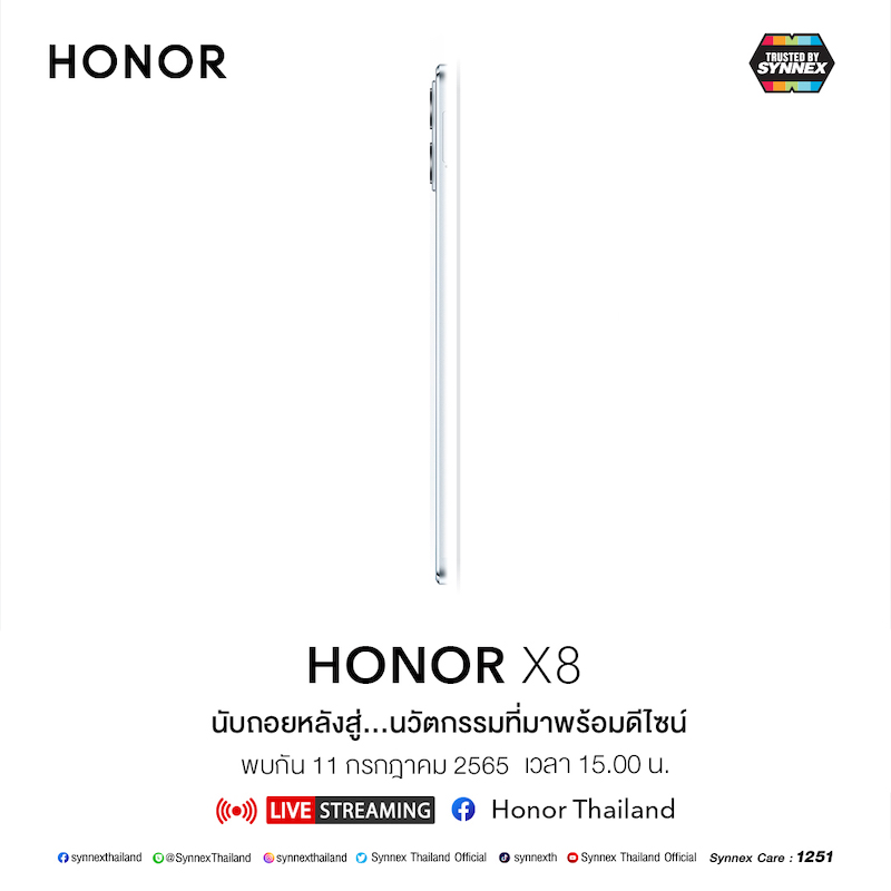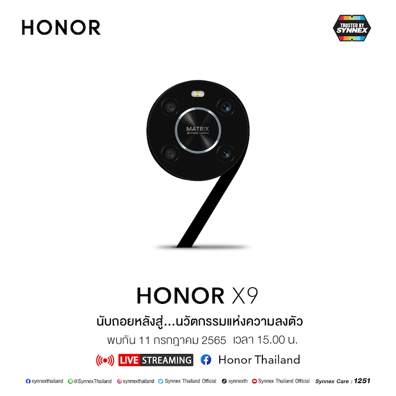 HONOR X Series ถูกปล่อยทีเซอร์ออกมาแล้วก่อนหน้านี้ ทำให้เราทราบว่าจะมีด้วยกัน 3 รุ่น ได้แก่ X7, X8 และ X9 โดยจับมือกับ บริษัท ซินเน็ค (ประเทศไทย) จำกัด (มหาชน) หรือ SYNEX เพื่อเป็นผู้แทนจำหน่ายและให้บริการหลังการขายแบบครบวงจร ผ่านร้านค้าตัวแทนจำหน่ายกว่า 3,000 รายทั่วประเทศ และยังมีแผนเปิด HONOR Experience Store 5 สาขาในปีนี้ พร้อมด้วยงบลงทุนด้านแผนการตลาดกว่า 150 ล้านบาท และยังพร้อมให้การรับประกันและบริการหลังการขายระดับพรีเมี่ยม ภายใต้ตราสัญลักษณ์ Trusted by SYNNEX
