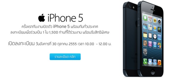ร่วมเป็น 1 ใน 1,500 ท่านแรก เพื่อร่วมงานเปิดตัว iPhone 5 พร้อมกัน 4 แห่ง ทั่วประเทศ กรุงเทพฯ เชียงใหม่ ขอนแก่น และภูเก็ต พร้อมรับสิทธิพิเศษในงาน เปิดลงทะเบียนในวันอังคารที่ 30 ตุลาคม 2555 ตั้งแต่เวลา 10.00 – 12.00 น. พิเศษ!! รับฟรี dtac Stereo Bluetooth มูลค่า 2,250 บาท