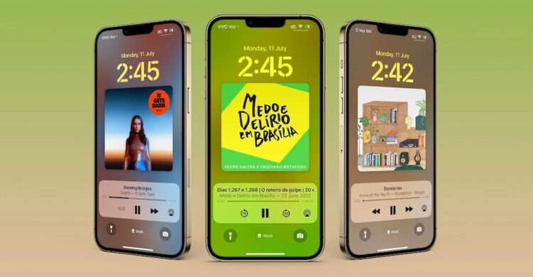 ตัวอย่างเพลงและพอดคาสต์บนหน้าจอ Lock Screen ของ iOS 16 Beta ยังมีการเน้นที่ชื่อเพลงและข้อมูลศิลปิน แต่ตัวควบคุมระดับเสียงหายไปจากหน้าจอ Lock Screen นอกจากว่าจะมีการเล่นเพลงหรือพ็อดคาสท์ผ่าน HomePod