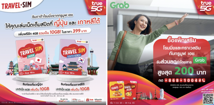 เร็ว แรง เต็มสปีด…ทรูมูฟ เอช มอบสิทธิพิเศษให้เน็ตเพิ่มแบบจุใจ เมื่อเปิดใช้งาน ทราเวลซิมญี่ปุ่น และเกาหลีใต้ จากปกติ 6GB ให้ฟรีเพิ่มอีก 4GB เป็น 10GB ใช้ได้10 วัน ในราคา 399 บาทเท่าเดิม พิเศษยิ่งขึ้น!! สำหรับลูกค้าทรูมูฟ เอช แบบรายเดือนและแบบเติมเงิน ซื้อแพ็กเสริมโรมมิ่งและทราเวลซิม (ซิมท่องเที่ยวต่างประเทศ) เมื่อใช้บริการ JustGrab, GrabCar สำหรับการเดินทางไปและกลับสนามบิน ที่ร่วมรายการทั่วประเทศ โดยสามารถรับส่วนลดสูงสุดมูลค่า 200 บาท (สูงสุด 100 บาทต่อครั้ง*) เพื่อใช้เป็นส่วนลดค่าบริการ Grab เพียงกด *868*1004# โทรออก ตั้งแต่วันนี้ถึง 30 กันยายน 2565