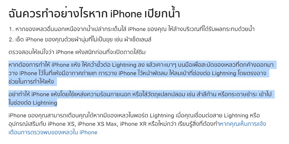 ทั้งนี้ ฝ่ายสนับสนุนของ Apple แนะนำว่า ถ้าหาก iPhone ตกลงไปในน้ำ ให้ถือ iPhone ในแนวตั้ง (โดยพอร์ต Lightning อยู่ด้านล่าง) แล้วเคาะเบาๆ บนฝ่ามือ เพื่อให้น้ำออกมาจากพอร์ต Lightning จากนั้นให้วาง iPhone ไว้ในที่แห้งและมีอากาศถ่ายเท หรือจะวางไว้หน้าพัดลม ให้ลมเป่าเข้าไปในพอร์ต Lightning จะทำให้แห้งเร็วขึ้น แต่ไม่ควรทำให้แห้งด้วยอุปกรณ์ให้ความร้อน ไม่ห้ามแหย่สิ่งแปลกปลอมเข้าไปในพอร์ต Lightning