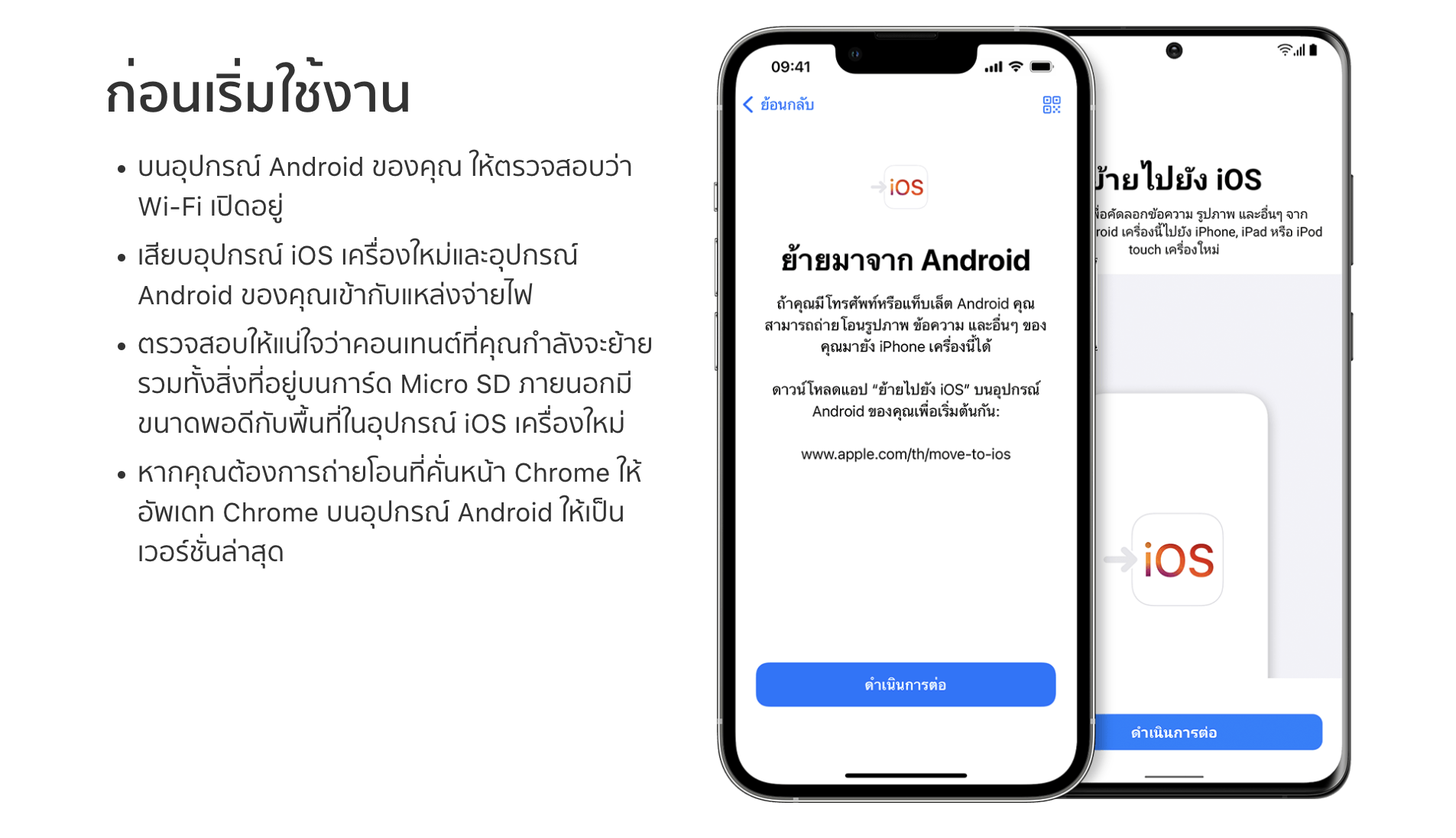 • ตรวจสอบให้แน่ใจว่าคอนเทนต์ที่คุณกำลังจะย้าย รวมทั้งสิ่งที่อยู่บนการ์ด Micro SD ภายนอกมีขนาดพอดีกับพื้นที่ในอุปกรณ์ iOS เครื่องใหม่