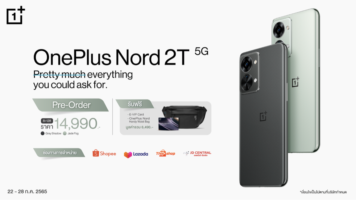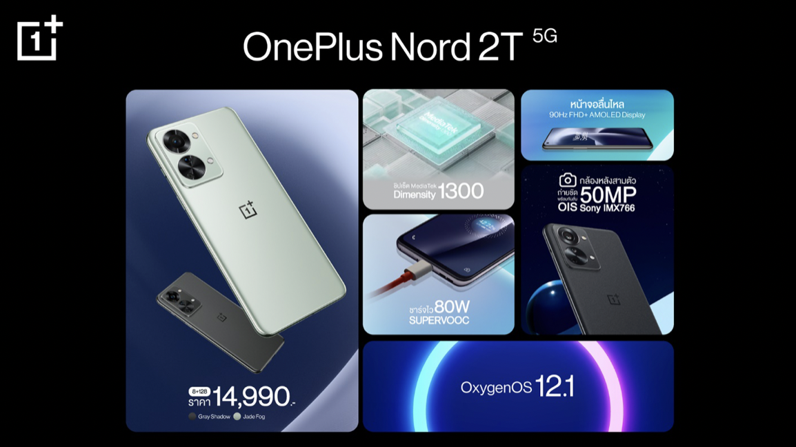 OnePlus ประเทศไทยเปิดตัวสองสมาร์ทโฟนรุ่นใหม่อย่างเป็นทางการ พร้อมเปิดให้จองกันแล้ววันนี้! สำหรับสมาร์ทโฟนนักฆ่าเรือธงรุ่นใหม่ล่าสุด OnePlus Nord 2T 5G ภายใต้สโลแกน ‘Pretty much everything you could ask for.’ ให้ทั้งหมดที่คุณต้องการ เน้นจุดเด่นในเรื่องความเร็ว แรง และประสบการณ์ใช้งานที่สนุกสนาน สเปคจัดเต็มด้วย MediaTek Dimensity 1300 เร็วแรง ตอบโจทย์ทุกการใช้งาน ทรงพลังด้วยการชาร์จไว เทียบเท่าเรือธง 80W SUPERVOOC, ภาพสวย จอลื่นไหล 90Hz FHD+ AMOLED ไม่มีสะดุด กล้องหลัง 3 ตัว 50MP Sony IMX766 พร้อมระบบกันสั่น และ A.I. ช่วยให้ภาพสวย คมชัด และ OxygenOS 12.1 ระบบปฏิบัติการอันเป็นเอกลักษณ์ เร็วและตอบสนองไวที่สุดของ OnePlus